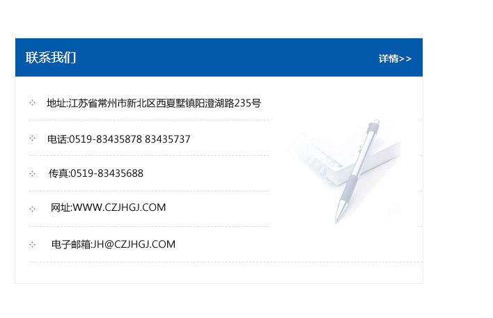 傳真:0519-83435688    郵編:213135    網址:WWW.czjhgj_com.bjdfsx.com    電子郵箱:JH@czjhgj_com.bjdfsx.com
